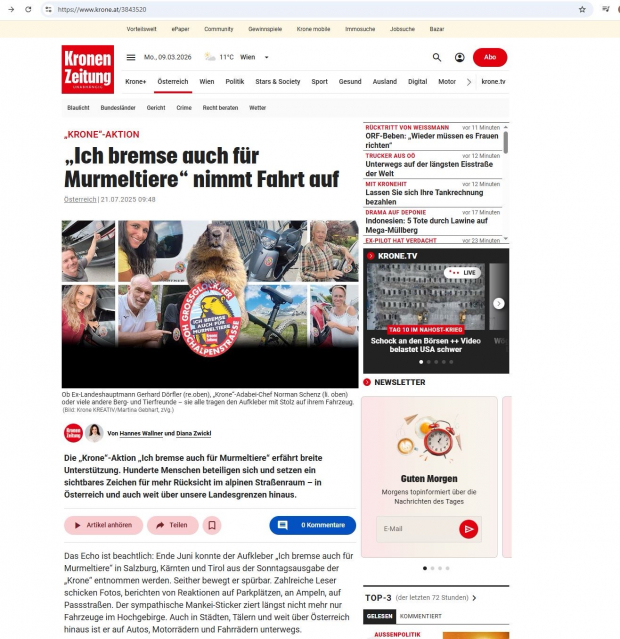 29. Juni 2025 by funky Ich bremse auch für Murmeltiere Ich freue mich über die Krone Aktion „Ich bremse auch für Murmeltiere“ für mehr Achtsamkeit und Rücksichtnahme auf Österreichs Alpenstraßen! Wie man sieht, die Murmeltiere auch: Zum Artikel Posted in Allgemein. RSS 2.0 feed.